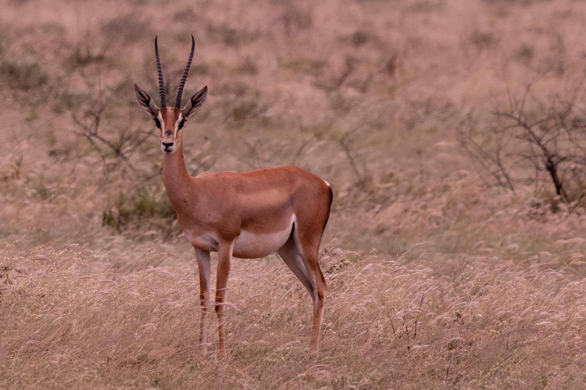 非洲瞪羚,羚羊届脖子最长的“美人羊”,同时也是动物界的“长腿欧巴”。其体型不大,却有着长长的耳朵大大的眼睛,行动敏捷,能以每小时80公里的速度奔跑,速度仅次于猎豹。有趣的是,非洲瞪羚在受到外界惊吓的时,不会选择逃跑,而是突然跳起来,一跃就能达到惊人的三米!用来警告同伴有危险,同时也能起到迷惑敌人的作用。