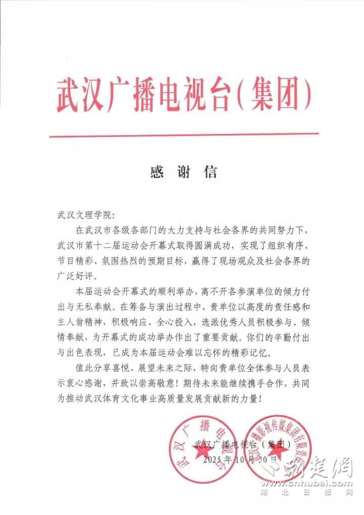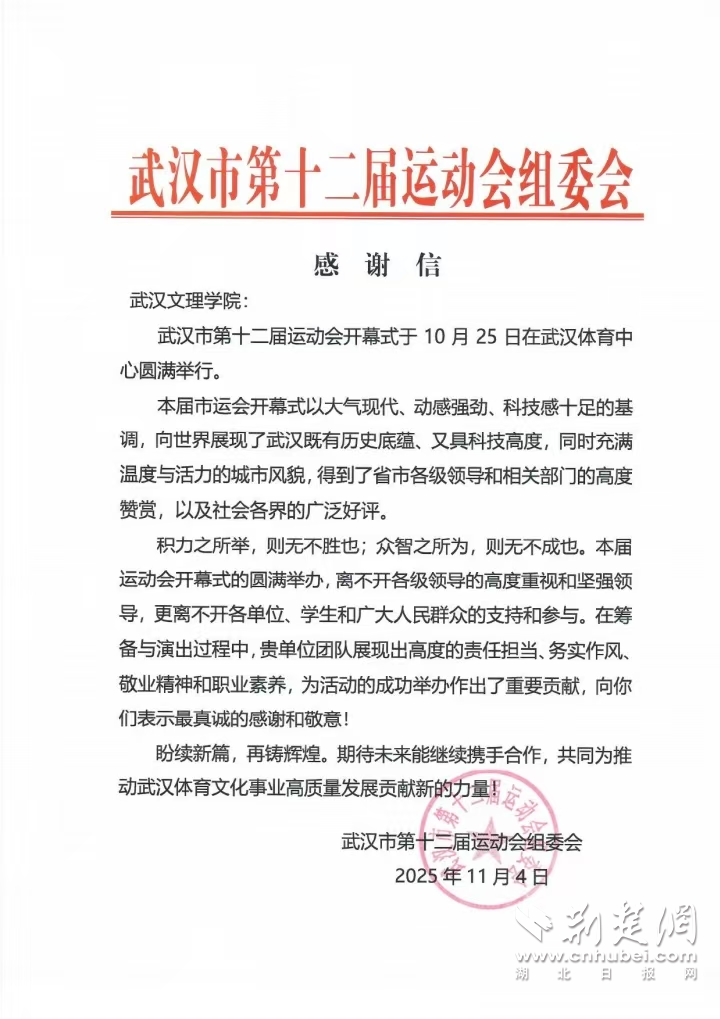 荆楚网(湖北日报网)讯(记者唐天琪 通讯员施慧丽)近日正规配资十大排名,武汉文理学院收到武汉市第十二届运动会组委会和武汉广播电视台发来的感谢信,字里行间充满着真挚的谢意与高度认可。这份肯定不仅是对学校助力市运动会的褒奖,更彰显了武汉文理学院高尚的精神风貌,为这场“逐梦车谷,乐动江城”的体育盛会注入强劲动力。
