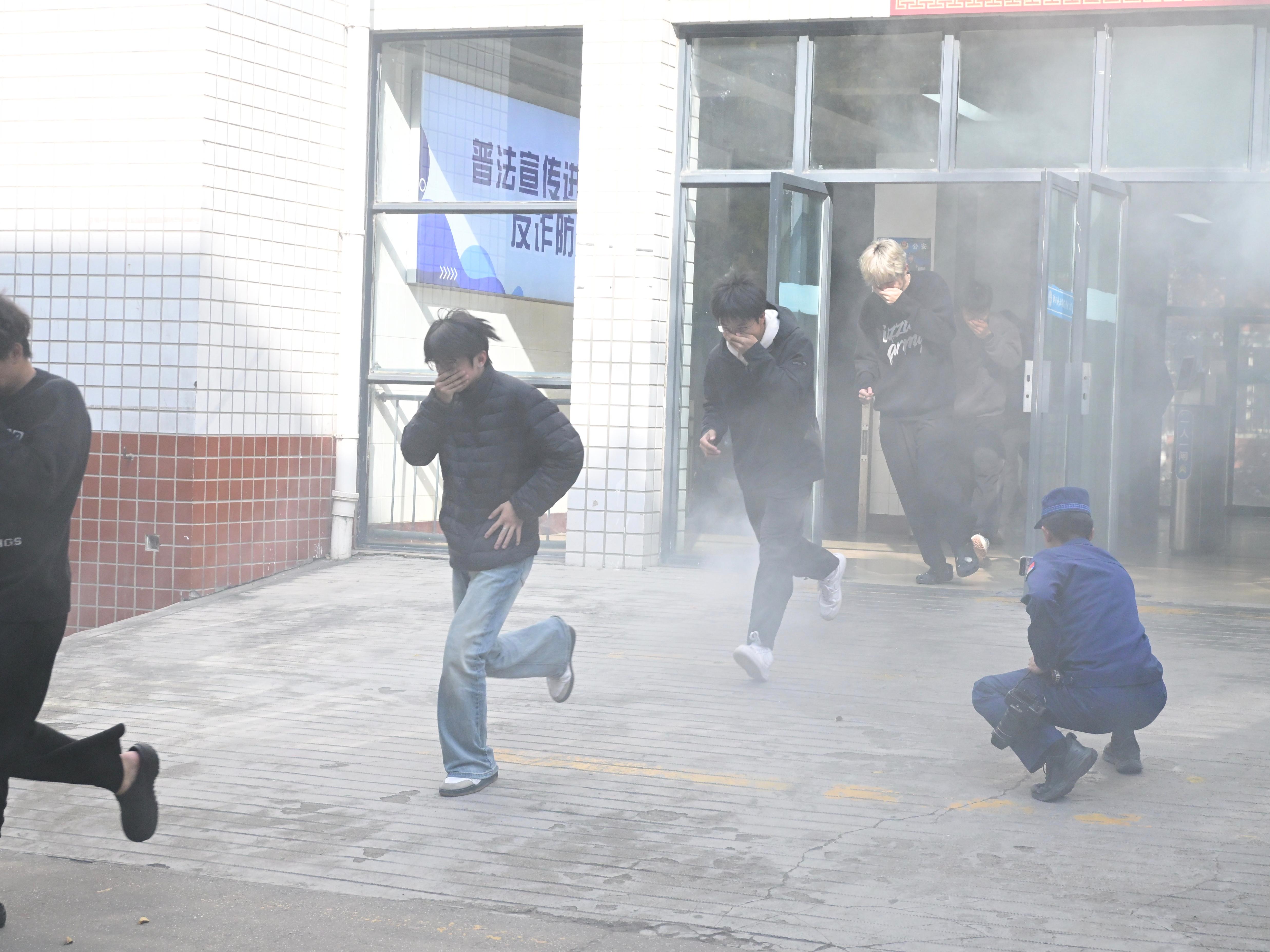 随着消防警报声骤然响起,模拟火灾逃生演练正式开始。师生们迅速捂住口鼻,弯腰低姿沿安全通道有序撤离,消防队员在关键节点引导疏散,确保全员快速抵达安全区域。整个演练过程节奏紧凑,有效锻炼了师生的应急反应能力。